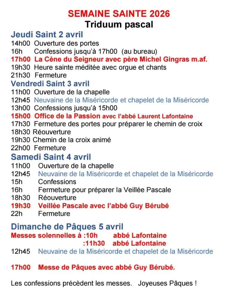 - Messes à midi et 17h, avec déposition du Saint Sacrement à 16h45 et confessions demi heure avant les messe